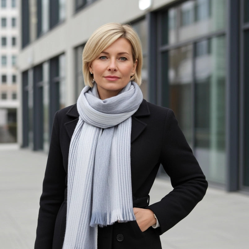 Cool and calming, the Polar Drift Brushed Alpaca Scarf features a serene palette of icy blue, soft grey, and crisp white in alternating stripes that evoke winter’s natural elegance. Its lightweight brushed finish offers cloud-like softness and warmth without bulk, ideal for elevated seasonal assortments. Sustainably crafted from luxurious alpaca fiber, this style merges modern minimalism with timeless appeal.