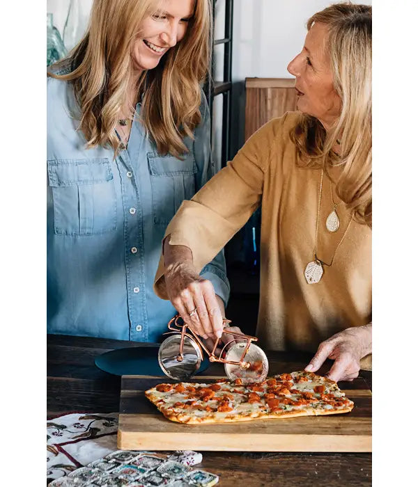 Grab a bike to eat... your pizza. Created by metalworkers in Moradabad, India, this stainless steel pizza cutter is a fun gift for a cyclist or for anyone who never tires of a good pie!
