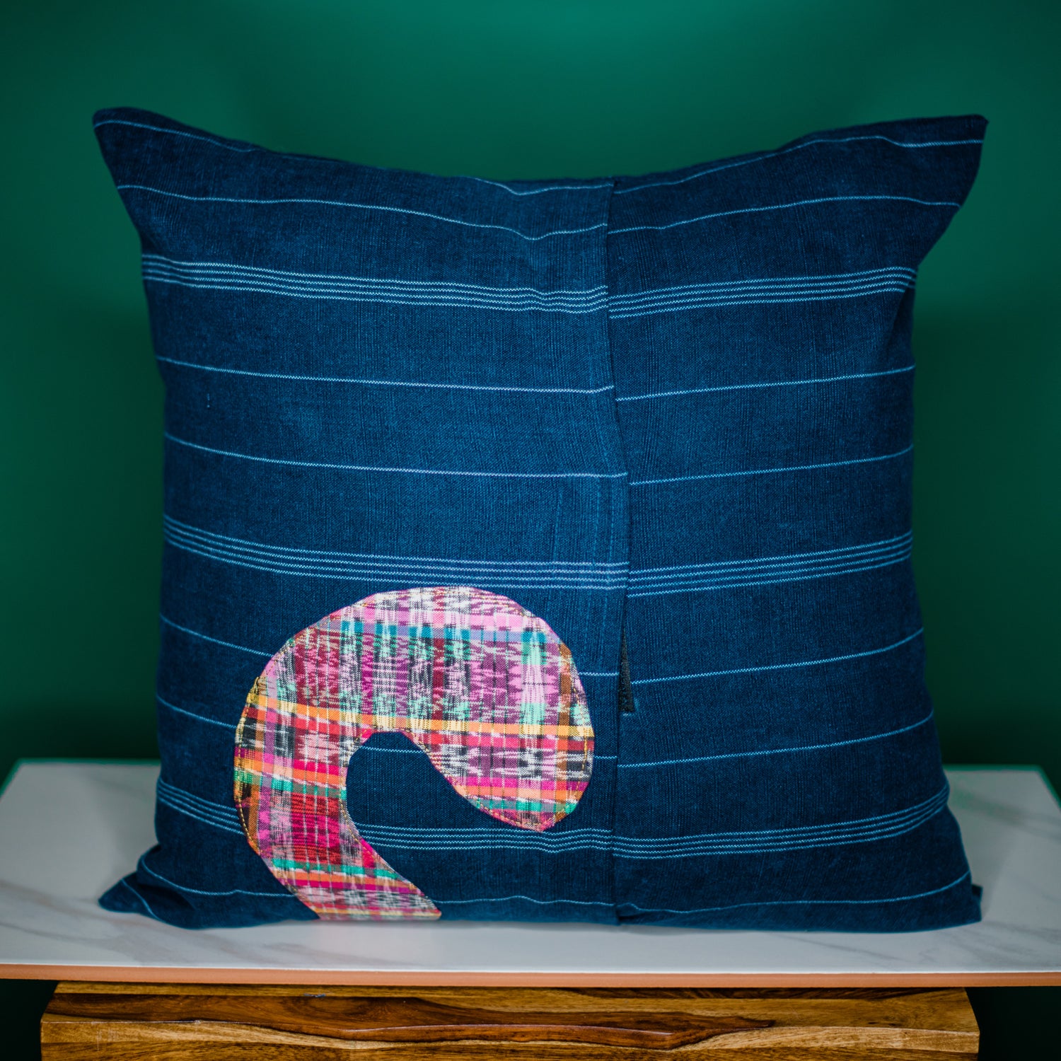 For all cat lovers! This pillow is made of upcycled materials featuring an adorable cat face and even little tail on the back made with cotton corte fabrics and blue background.