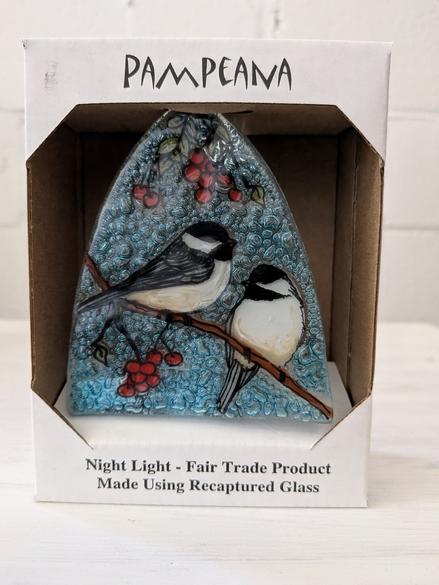This lovely, handmade Chickadee nightlight was crafted by Ecuadorian artisans using recycled glass and water-based paint. They make a beautiful addition to a kitchen, bathroom, bedroom, living room or even an outdoor patio! It arrives in a giftable box, with a light bulb included.