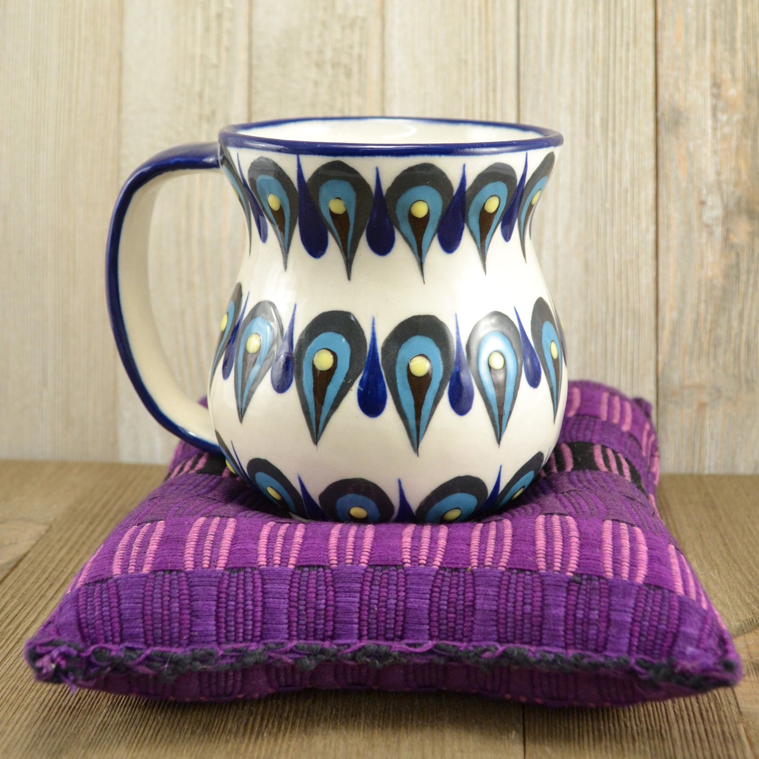 The fair trade San Antonio Palopo Coffee Cups in white are handcrafted by Guatemalan artisans who were trained by renowned ceramicist Ken Edwards. The fair trade cup is dishwasher/microwave safe. Each cup features varied colors and patterns due to the hand-painted nature of each.