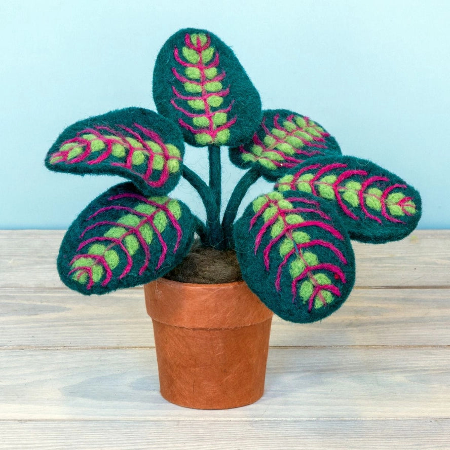 No watering needed for this hand felted Prayer Plant! Decorative natural wool leaves are mounted onto wool wrapped stems that allow you to arrange the plant as you like. Set into a sturdy handmade eco-pot using sustainably harvested paper over recycled materials.