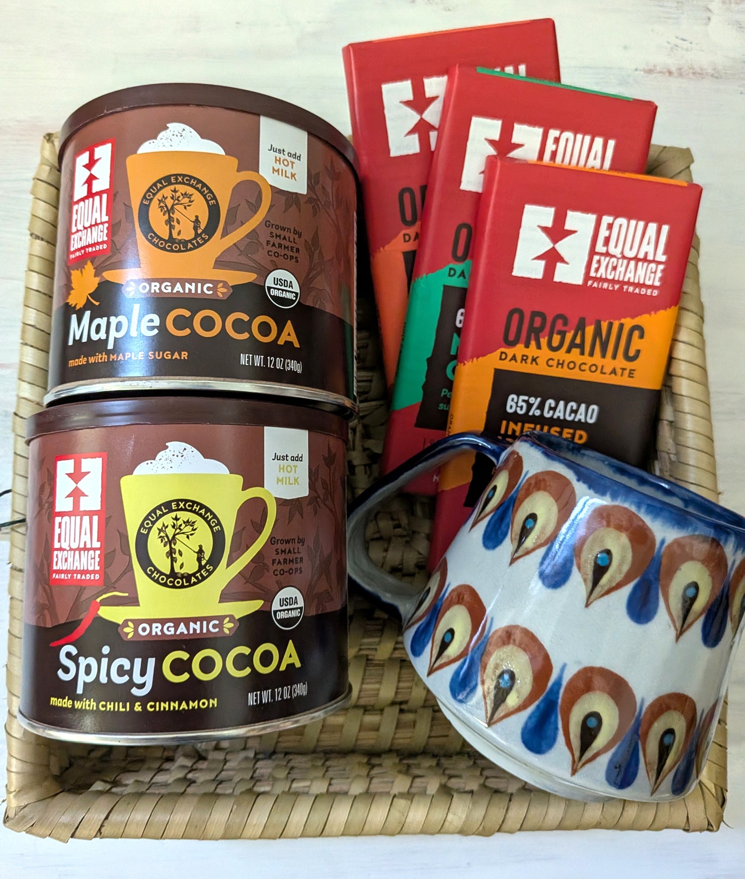 Look no further for a gift that will warm the heart of any chocolate lover! Rich, exquisitely crafted Fair Trade hot cocoa and chocolate bars paired with a handcrafted ceramic mug from Guatemala makes the perfect gift for solstice, housewarming, college students, and aging parents alike!