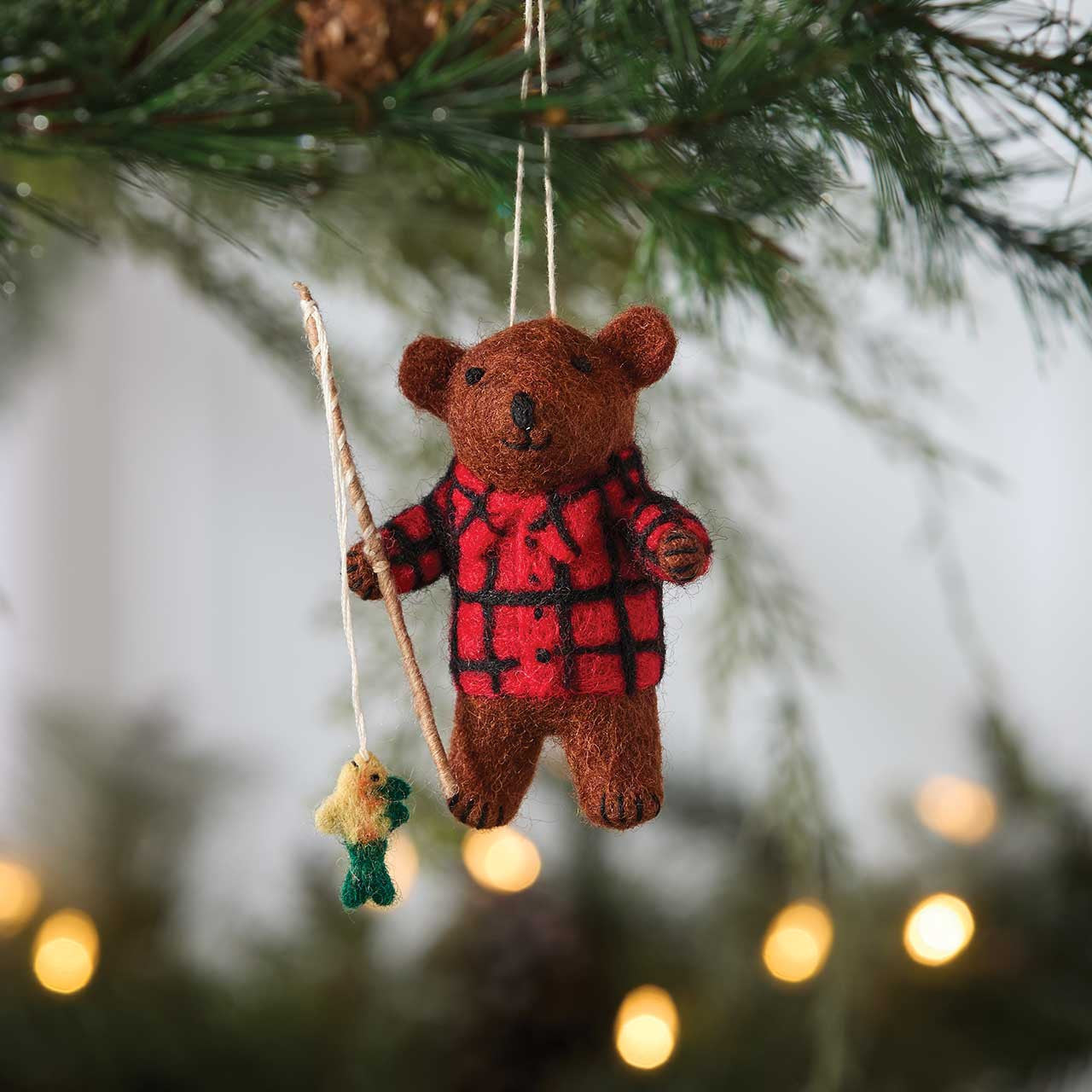 Celebrate the spirit of the outdoors with this charming felted bear ornament! Wearing a classic red buffalo plaid flannel shirt and holding a fishing pole with a tiny, freshly caught fish, this fuzzy fisherman brings a rustic woodland vibe to your holiday decorations.