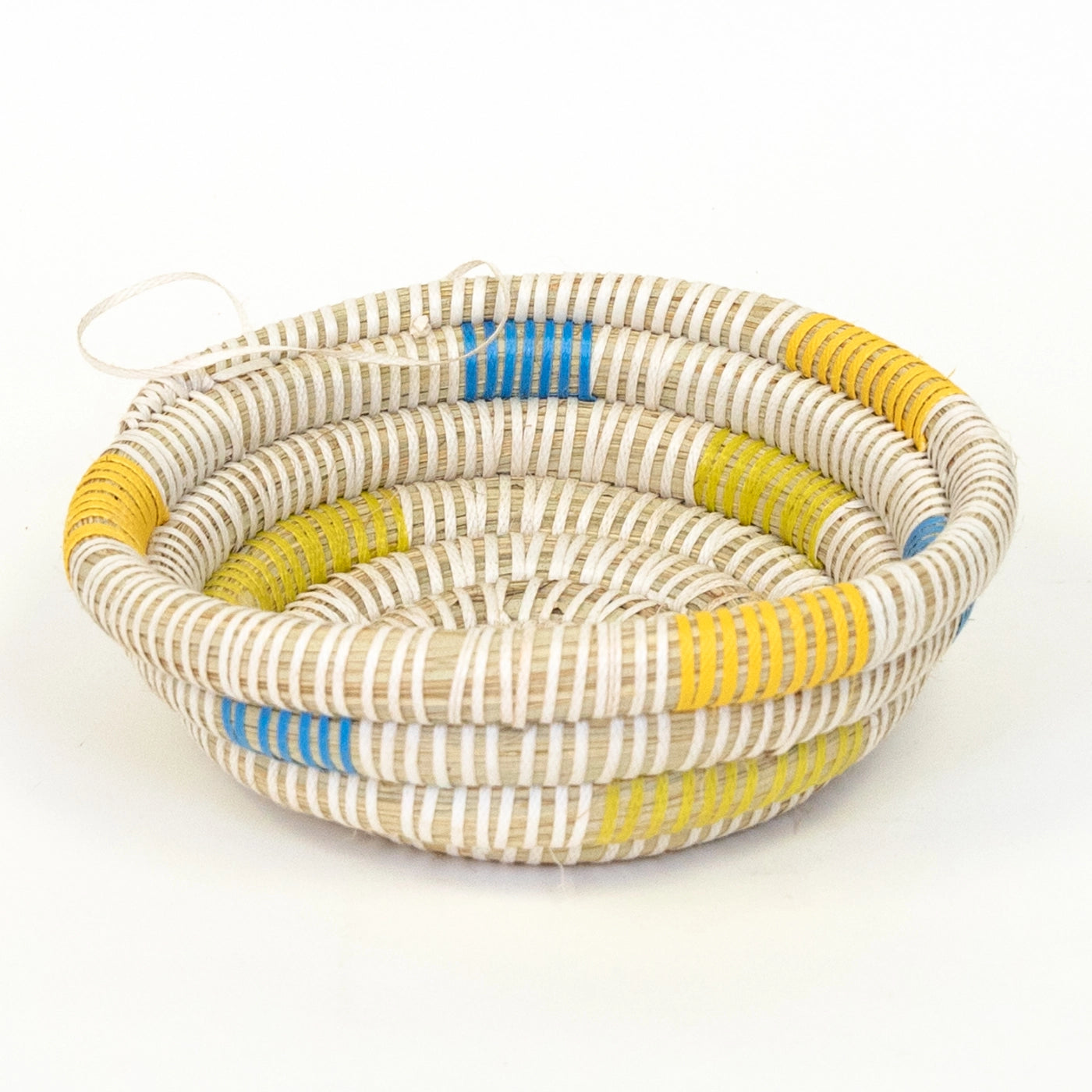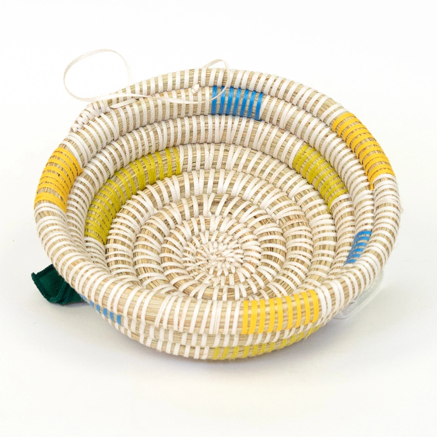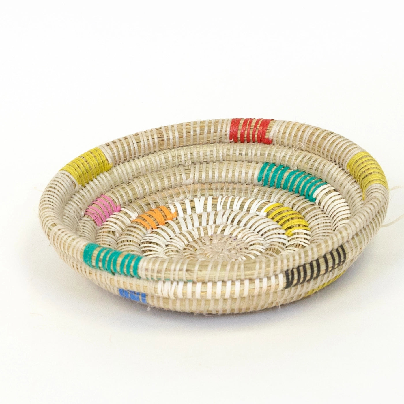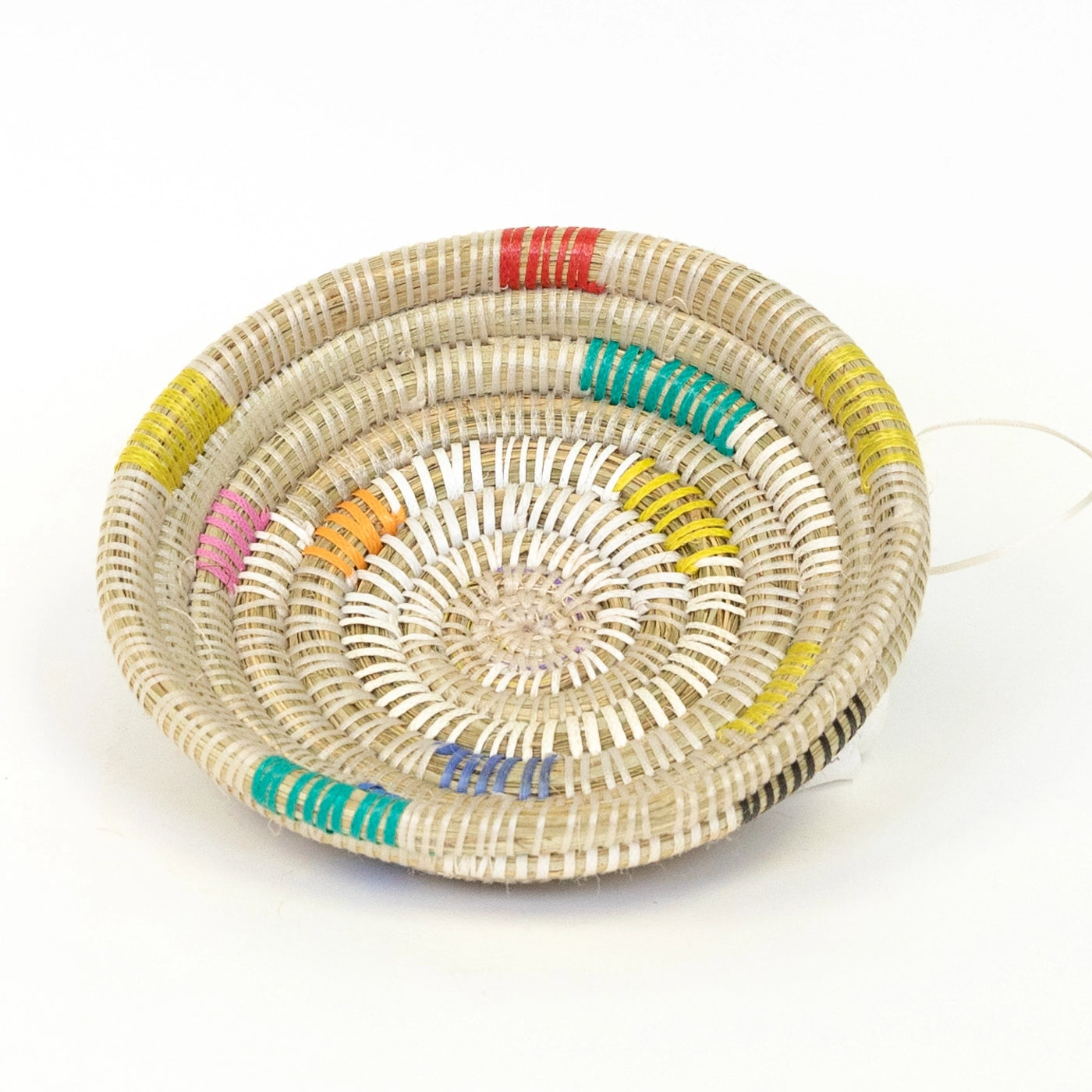 Beautiful, woven bowl handmade, ideal for fruit, produce but also useful on a desk or as a wall decoration! Patterns and colors vary slightly.