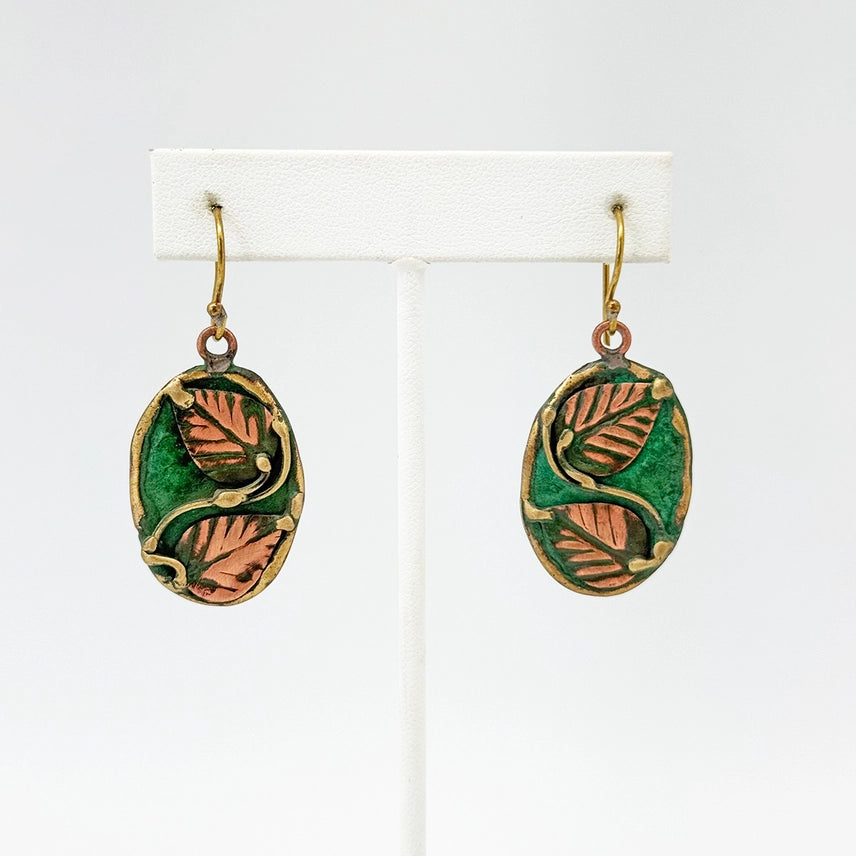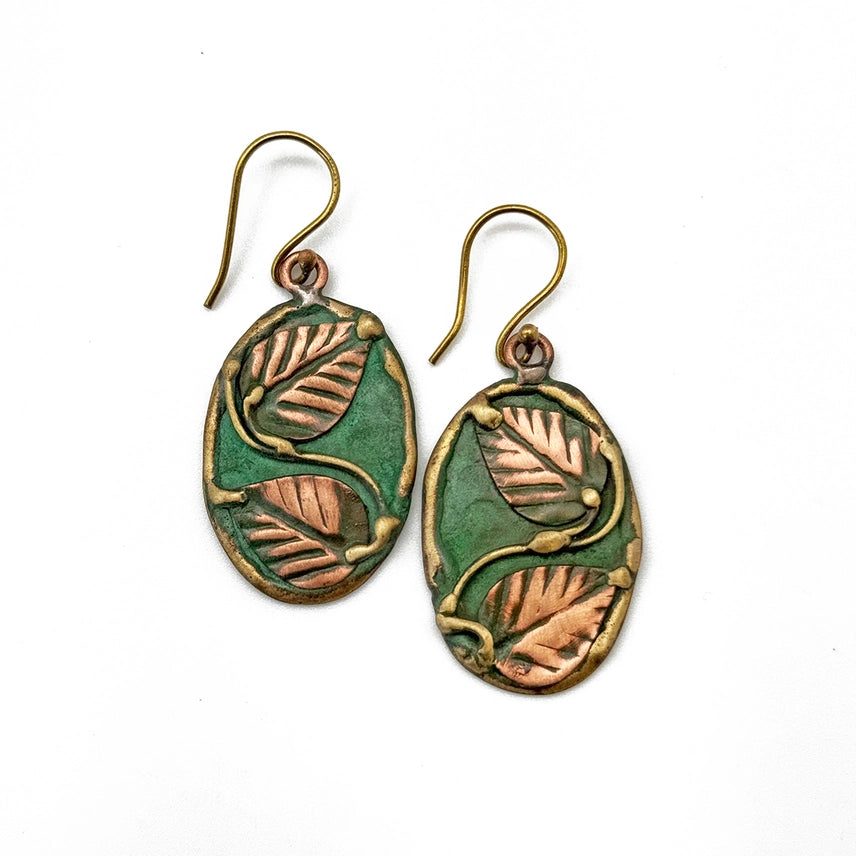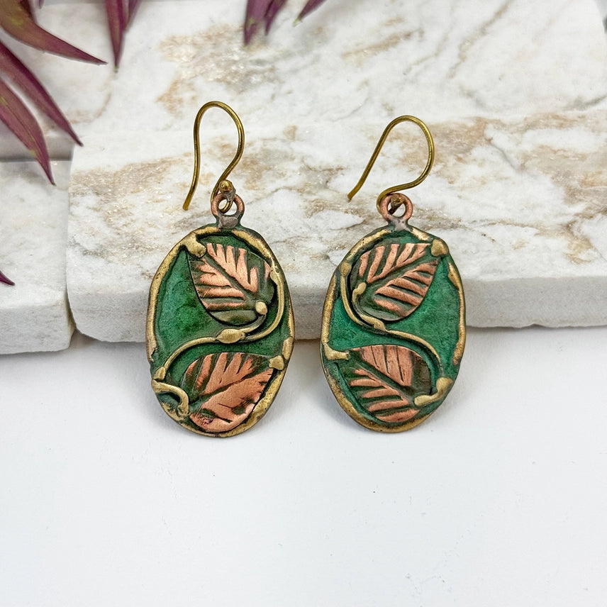 These handcrafted Green & Copper Vine Leaf Brass Patina Earrings are an oval dangle design from our Patina Earring Collection. Handcrafted in India, these lightweight earrings feature a beautiful vine pattern with copper-accented leaves on a deep green patina.