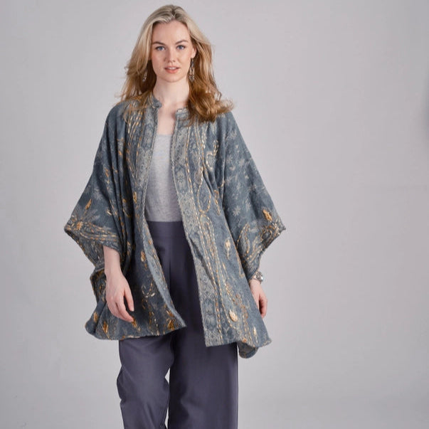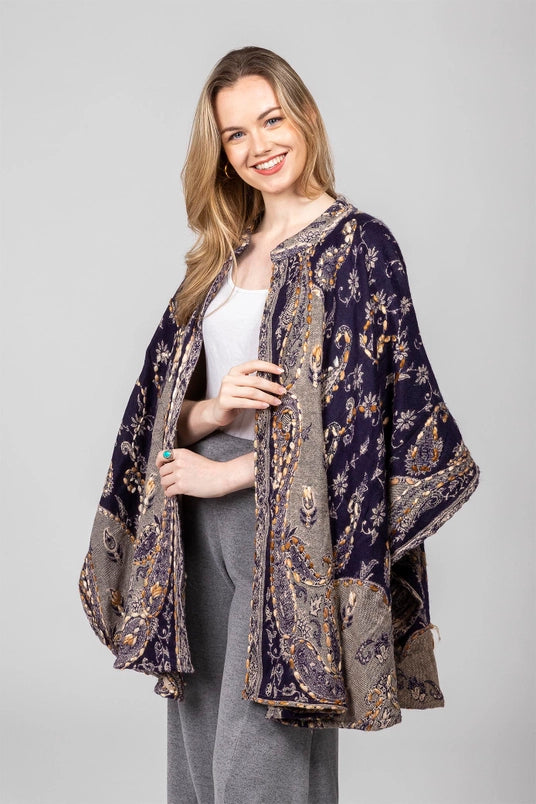 Delight in cooler weather with this elegant addition to your wardrobe! Finished with a hand-embroidered paisley motif and open front cape, this jacquard poncho is sure to brighten up your outfit.