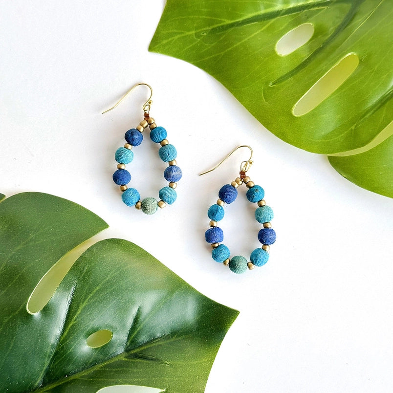 Your favorite teardrop earring style has been reimagined in shades of blue! Tiny fabric beads crafted from upcycled Kantha & Sari textiles alternate with tiny golden beads on a teardrop-shaped wire.
