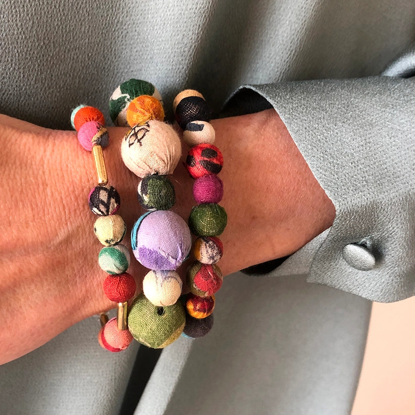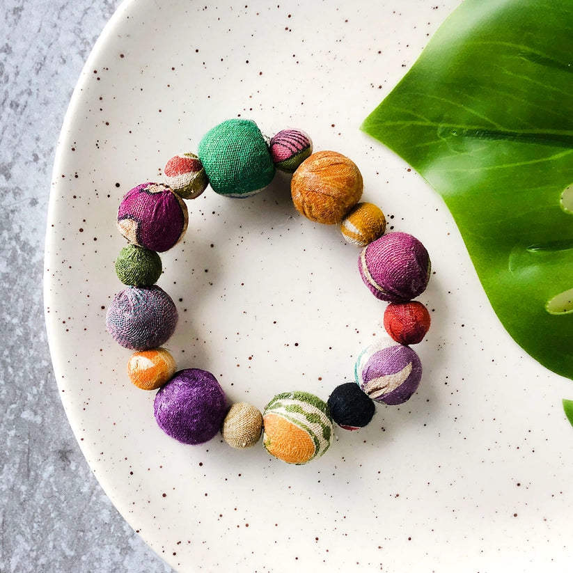 Add a pop of color to your day with our Betty Bauble Bracelet! Alternating large and small-sized colorful kantha textile beads make this silhouette an easy-to-wear favorite.