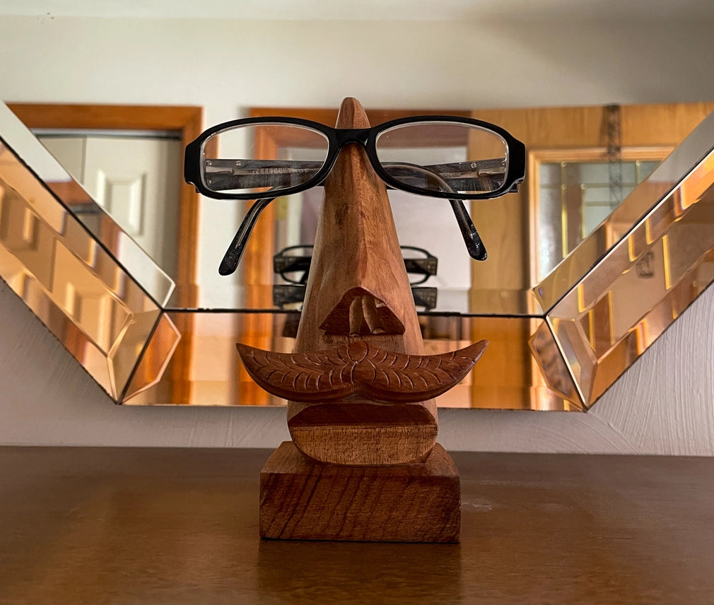 Stop losing your glasses! This fun and function glasses holder makes a great gift for the hard-to-shop-for man in your life! Created from light and grainy mango wood or darker sheesham wood sourced by our artisans in Moradabad, India. This product is Fair Trade Certified.