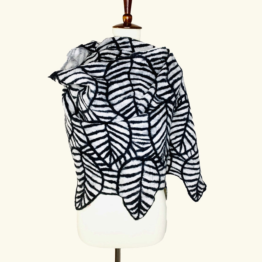 A stunning piece designed to add texture to your look. Wrap yourself in glamour with this hanging black and white outlined leaf design. This wrap is handmade, fair-trade in Nepal, and is crafted from merino wool felted onto chiffon.
