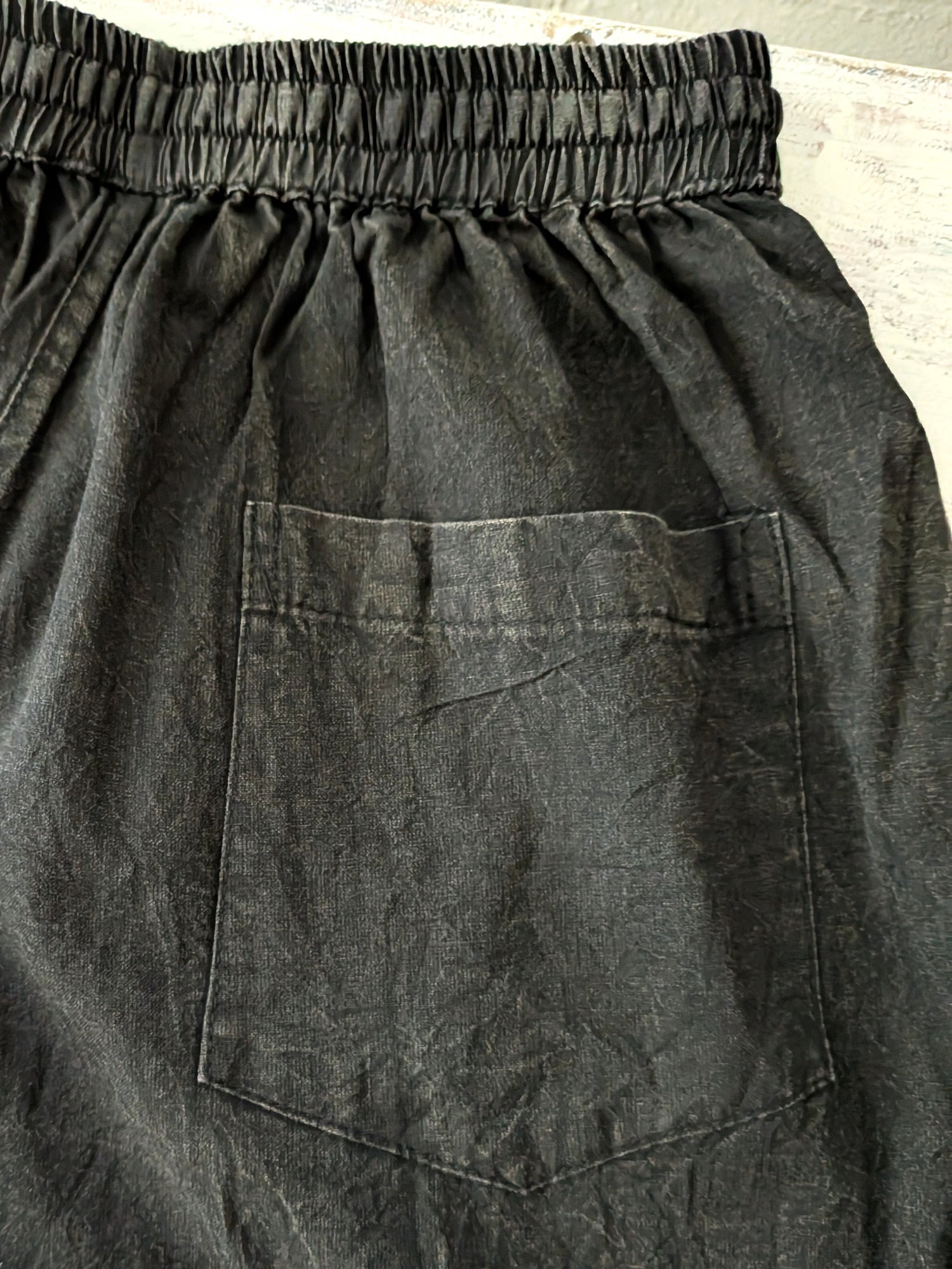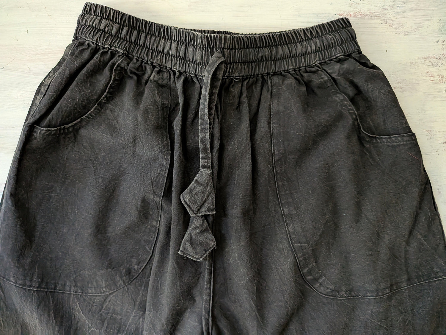 Enzyme washed full length pant that has an elastic waist with drawstring, and a straight leg. These pants have two outer sewn front pockets. So comfortable and flattering!