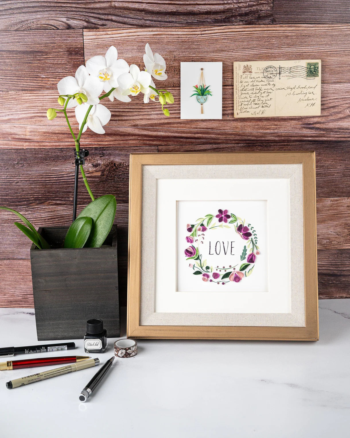 Show your eternal love with our exquisite Quilled Wreath Love card. This stunning design beautifully captures the symbol of eternity, featuring a meticulously crafted quilled wreath adorned with flowers and petals, with the word "Love" elegantly written in pink. This card is the perfect way to express your everlasting love to your significant other.