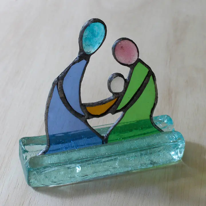 This beautiful glass nativity is a fair trade product handmade out of recycled glass in Kenya by Simon and Alice and their team. The pieces of the bodies are cut and soldered into place. The heads are melted from recycled glass before being soldered to the bodies.