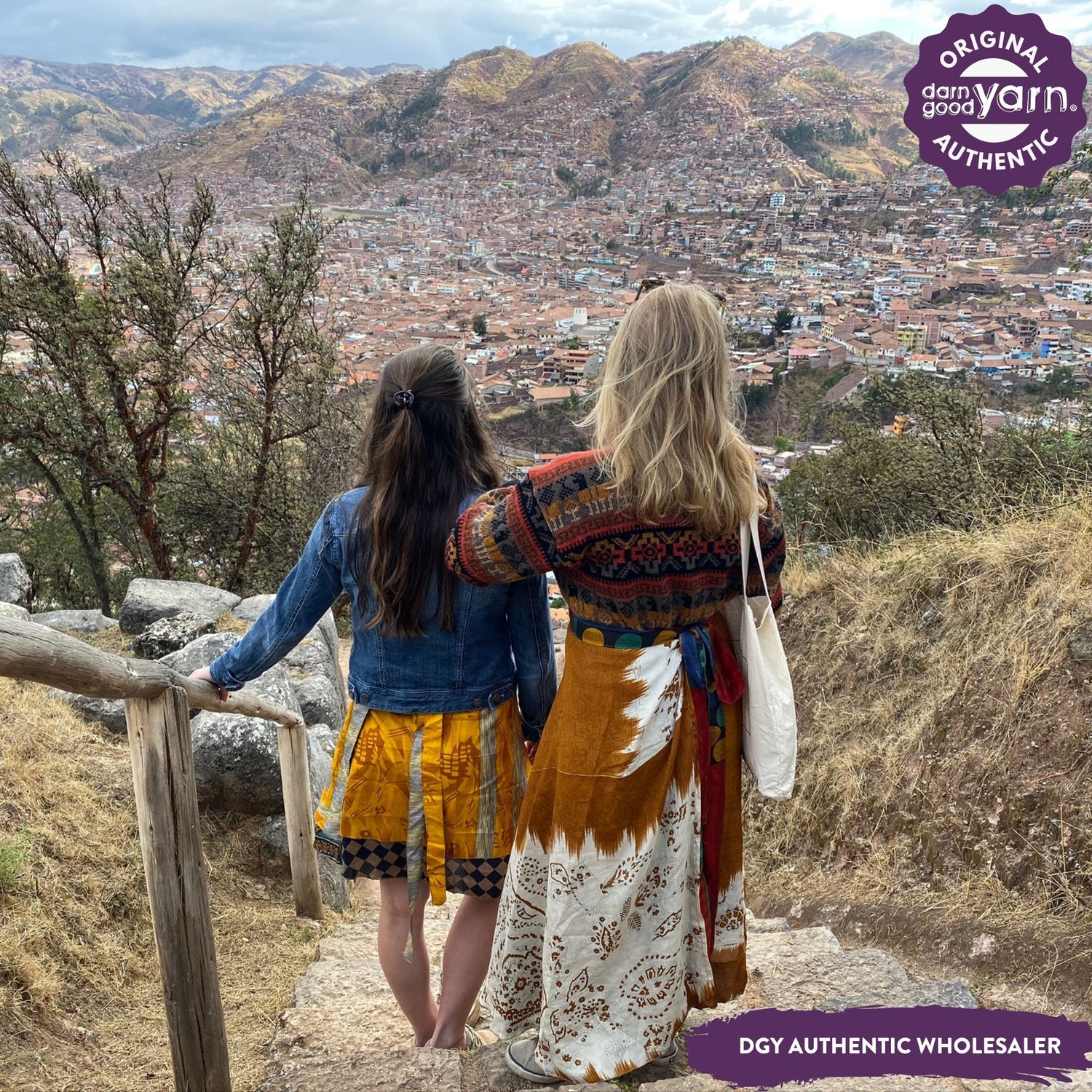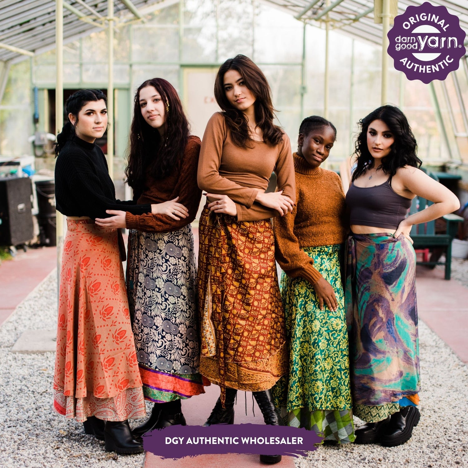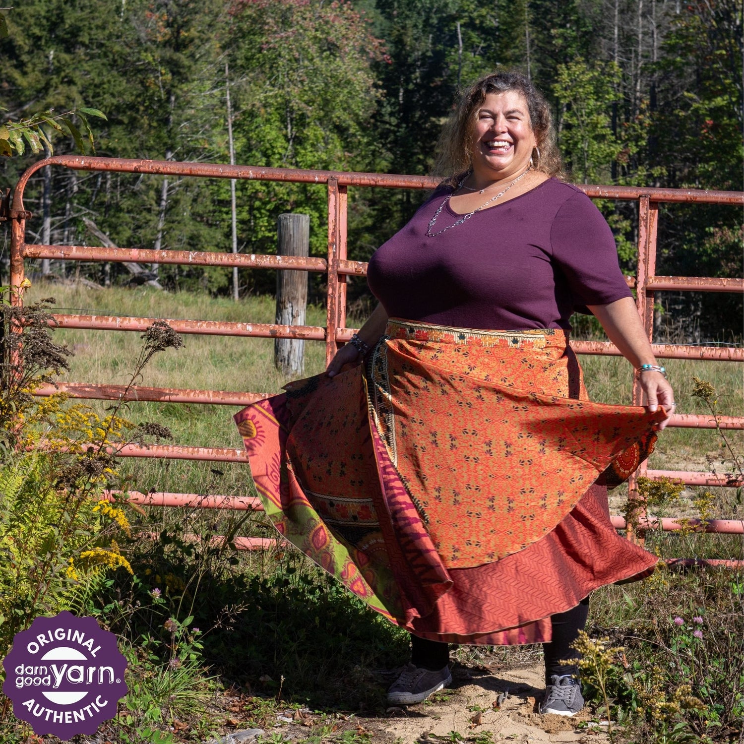 As comfortable as your yoga pants but way more beautiful. Each skirt is handmade by women's co-ops in India out of recycled saris and turned into one-of-a kind skirts. With your help, these artisans are able to sustain year-round employment.