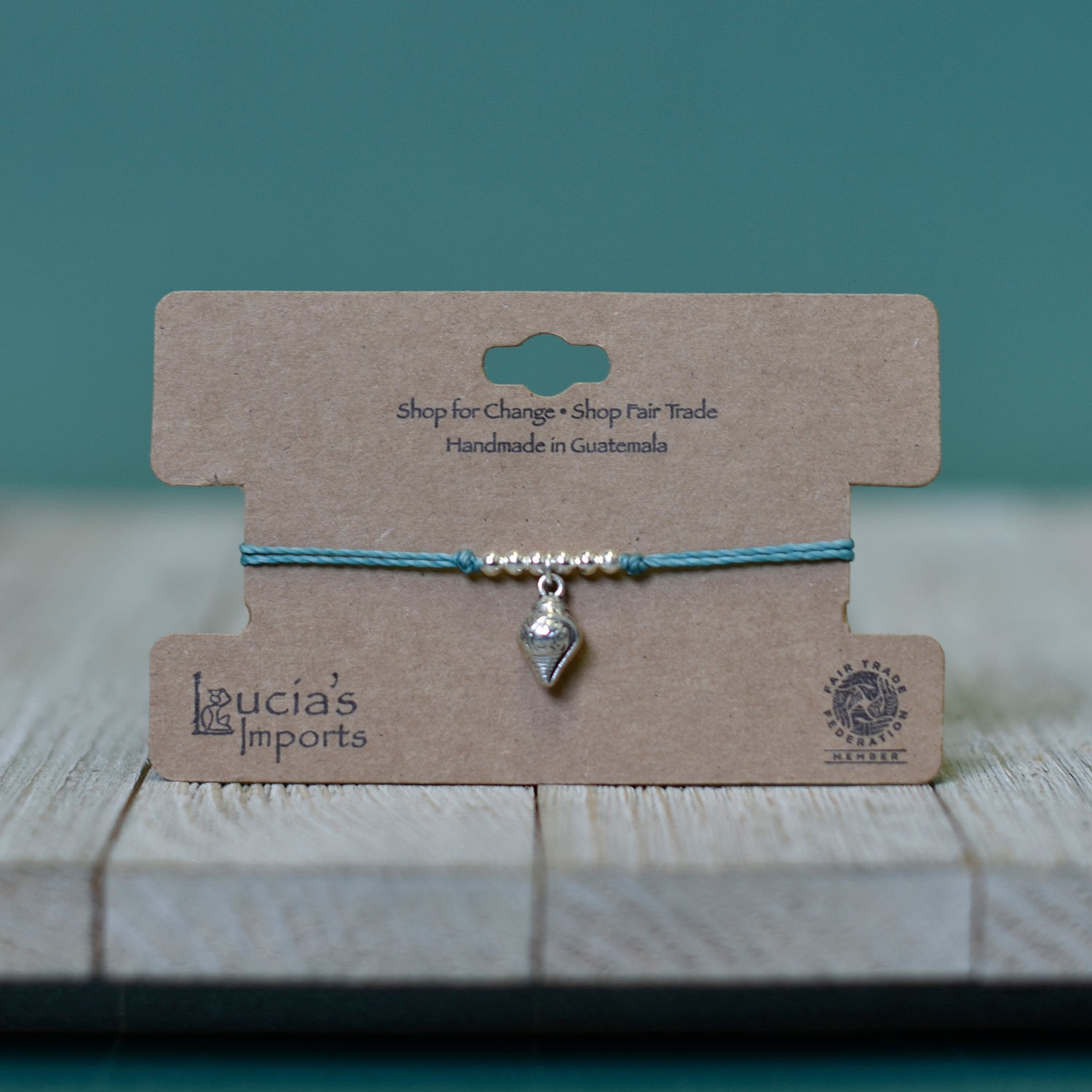 This fair trade String Bracelet is made from colorful string with a silver metallic conch shell symbol bead at the center. Each bracelet features a pull string slip knot closure to make them easy to wear. Stack them or wear it separately. Comes in assorted colors.