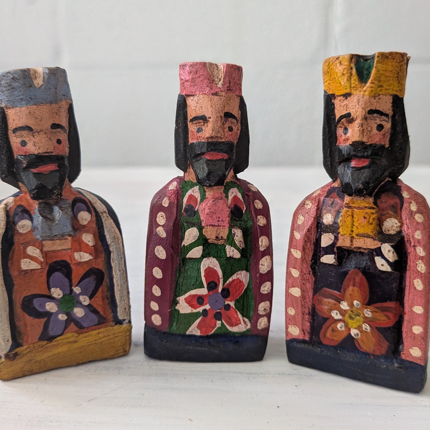 Celebrate a traditional Christmas with these small hand-carved and painted nativity sets from Guatemala. Each set is one of a kind with slight variations in color and pattern. 8 pieces each.