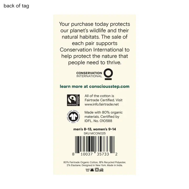It’s time to do something about the elephant in the room: elephants need our help! Each pair of these elephant-patterned socks helps protect elephants by empowering the wildlife rangers who care for them through the work of Conservation International. Available in men’s and women’s sizes, these are the perfect socks to show your love for elephants and commitment to protecting them. Conscious Step donates $1 to Conservation International for each pair of Socks that Protect Elephants sold.