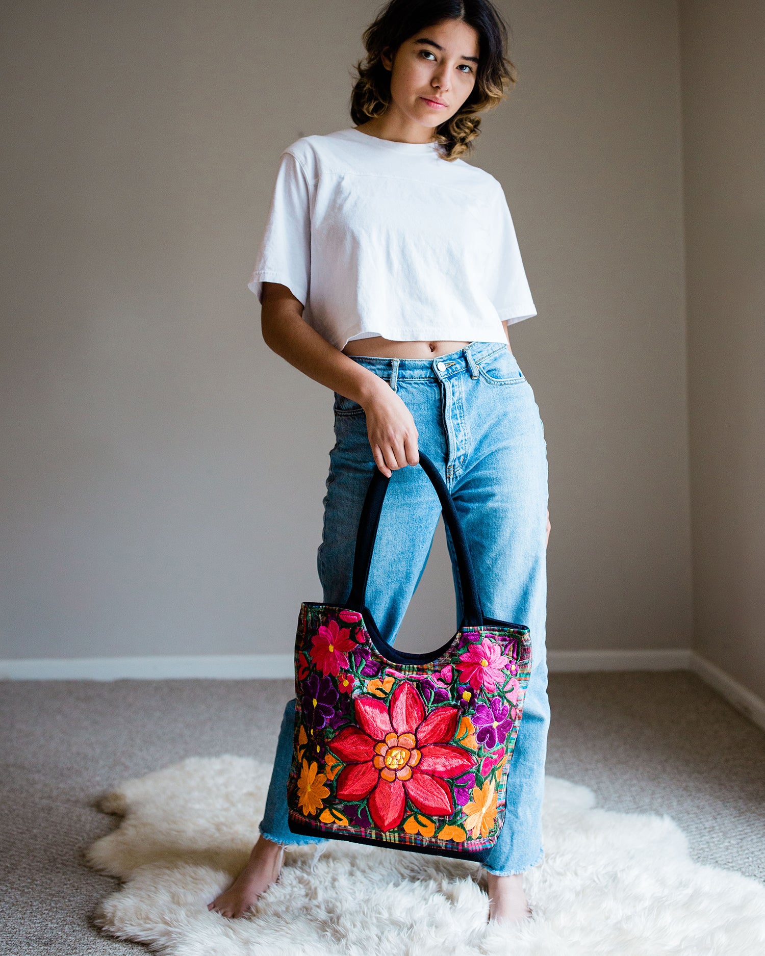 This beautifully made fair trade Sunflower Purse features an intricately embroidered sunflower pattern. It's a great overnight bag or big enough to carry your everyday essentials.